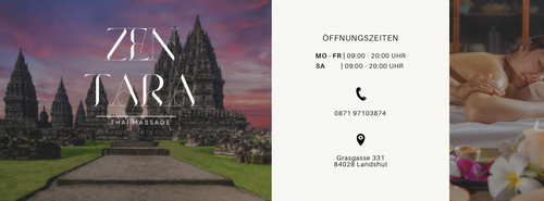 Zen Tara Thai Massage in Landshut bietet authentische thailändische Massagekunst für Wohlbefinden und Entspannung. Unser erfahrenes Team kombiniert traditionelle Techniken mit modernem Ansatz, um Verspannungen zu lösen und Körper, Geist und Seele in Einklang zu bringen. Besuchen Sie uns für eine ganzheitliche Auszeit vom Alltag – genießen Sie professionelle Behandlung in entspannter Atmosphäre, die Ihre Gesundheit fö...mehr lesen