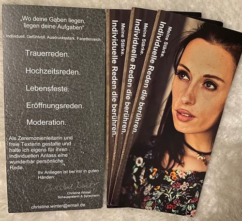 Guten Tag, ich bin Christine, professionelle Schauspielerin seit 2009 und freie Rednerin seit 2011. Ihre Lebensgeschichte, ihr besonderer Tag ist meine Herzensaufgabe, denn da wo deine Talente liegen, liegen deine Aufgaben. Berührende Worte finden, lebendiges erzählen, das ist meine Berufung. Ich freue mich wenn Sie mit mir in Kontakt treten.