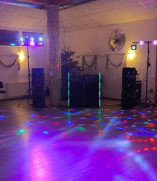 Einfache DJ Ausrüstung mit Controller, Laptop, Tontechnik, eine Lichtbar, 1x Funkmikrofon und Tisch.