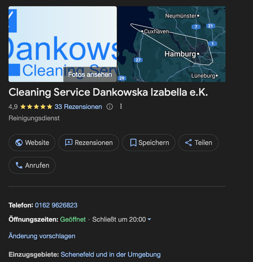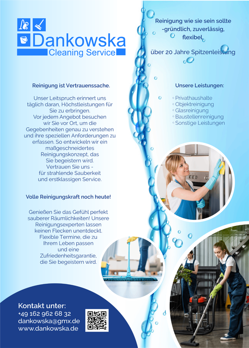 Mit über 20 Jahren Erfahrung steht Dankowska Cleaning Service für zuverlässige, gründliche und diskrete Reinigung in Hamburg. Ob Privathaushalt, Büro, Praxis oder gewerbliche Immobilie – wir bieten maßgeschneiderte Reinigungskonzepte mit festen Ansprechpartnern und geschultem Personal. Vertrauen, Qualität und Termintreue sind für uns selbstverständlich. Unsere Kund:innen schätzen den persönlichen Service und die nach...mehr lesen