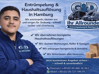 “G&D Ihr Allrounder Hamburg ist Ihr zuverlässiger Partner für professionelle Entrümpelungen und Haushaltsauflösungen in Hamburg und Umgebung. Wir unterstützen Privatpersonen und Unternehmen bei Wohnungsauflösungen, Kellerentrümpelungen, Dachbodenräumungen sowie der kompletten Räumung von Häusern und Gewerbeobjekten. Unser erfahrenes Team arbeitet schnell, sauber und zuverlässig, damit Ihre Räume wieder frei und nutzbar sind. Wir bieten Ihnen eine kostenlose Besichtigung vor Ort, bei der wir den Aufwand genau einschätzen und Ihnen ein faires Festpreisangebot machen. Schnelle Termine sind bei uns jederzeit möglich, oft auch kurzfristig. Unsere Leistungen im Überblick: • Entrümpelung von Wohnungen und Häusern • Haushaltsauflösungen in ganz Hamburg • Keller- und Dachbodenentrümpelungen • Räumung von Garagen, Lagern und Gewerbeflächen Wir sind in allen Hamburger Stadtteilen unterwegs, unter anderem in Altona, Wandsbek, Harburg, Bergedorf, Eimsbüttel und Hamburg-Mitte. Kundenzufriedenheit, Zuverlässigkeit und faire Preise stehen bei uns an erster Stelle. Kontaktieren Sie uns gerne für eine kostenlose Besichtigung und einen schnellen Termin.”